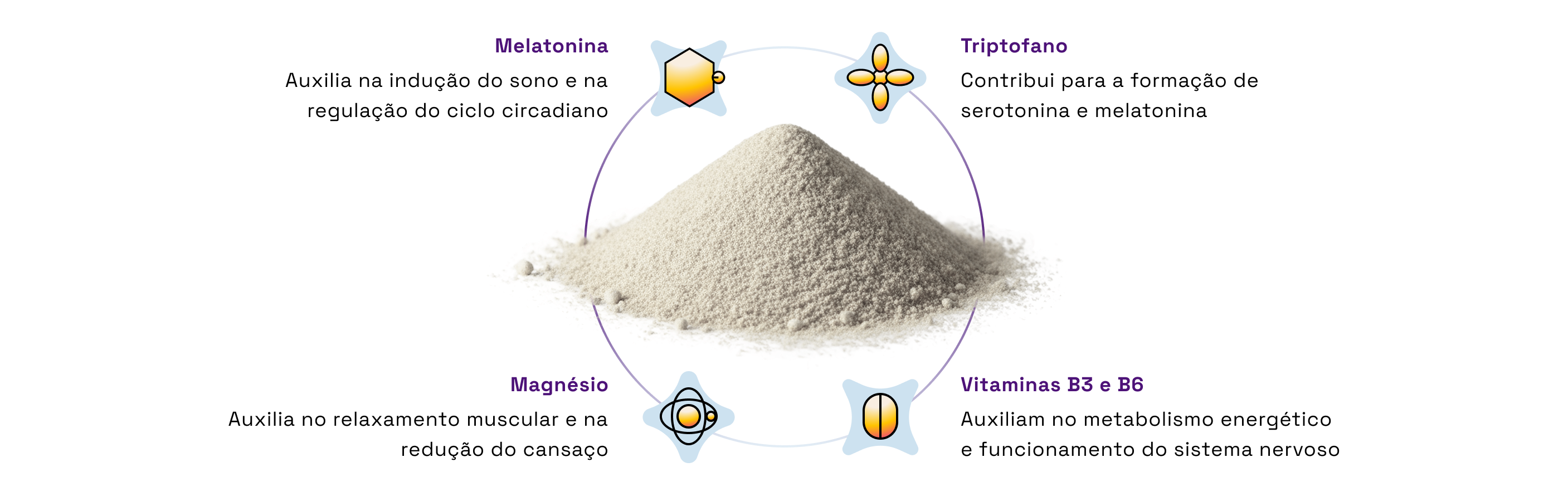 • Melatonina para regular o sono• Triptofano para produção natural de serotonina