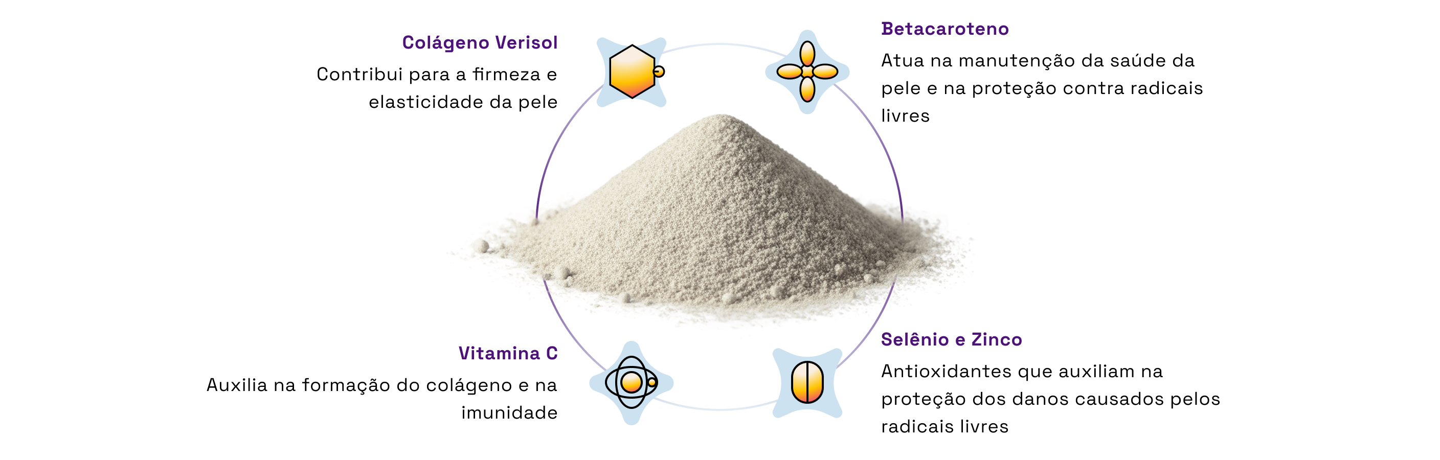 • Colágeno Verisol® + vitamina C• Betacaroteno e vitamina A para tom uniforme