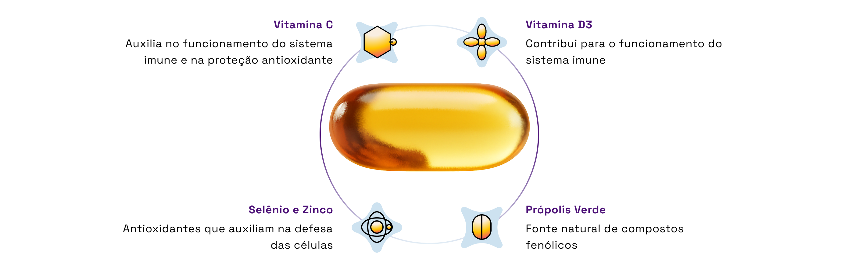• Vitaminas C (500 mg), D (50 µg), E (100 mg)• Selênio (320 µg) e Zinco (30 mg)