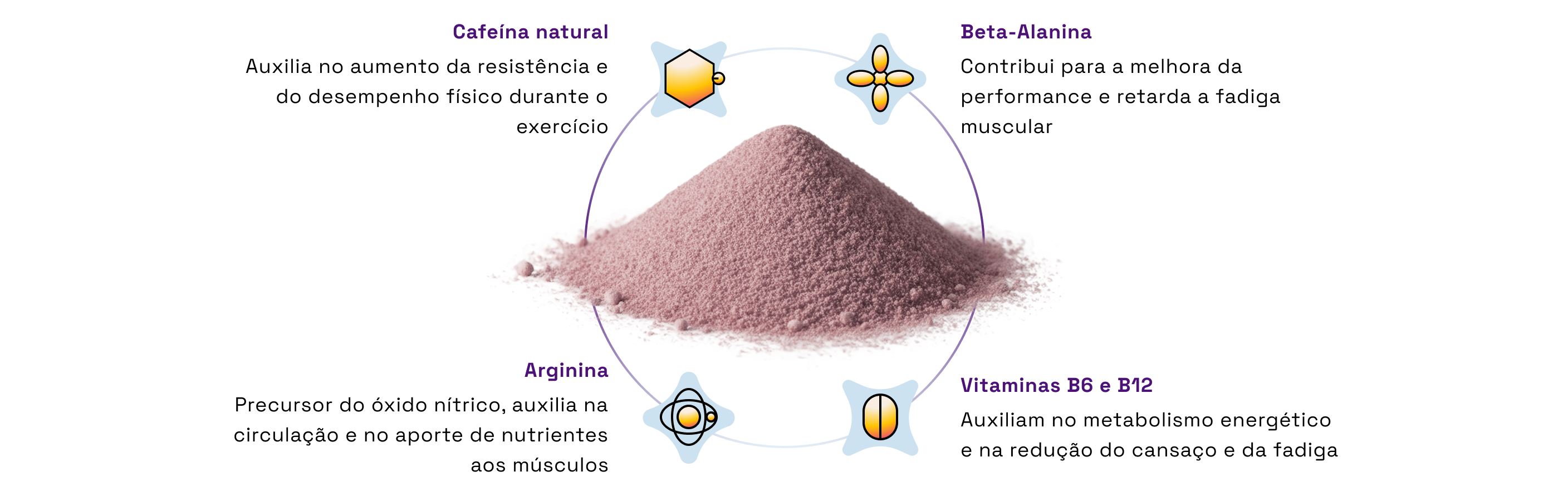 • 2 g de beta-alanina + 1 g de arginina• 150 mg de cafeína natural + vitaminas B5, B6 e B12