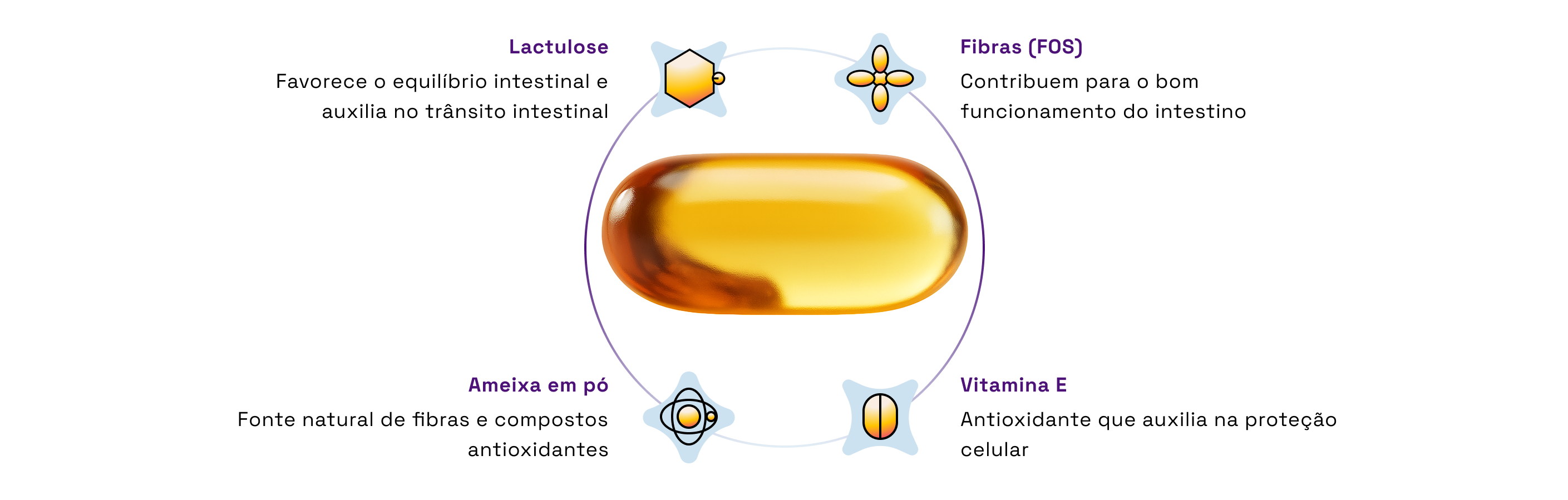 • Lactulose e prebióticos para regulação• Ameixa em pó e óleo de coco