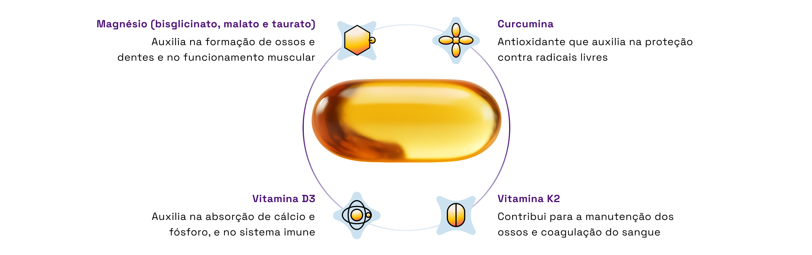 • Magnésio bisglicinato, malato e taurato• Curcumina antioxidante natural